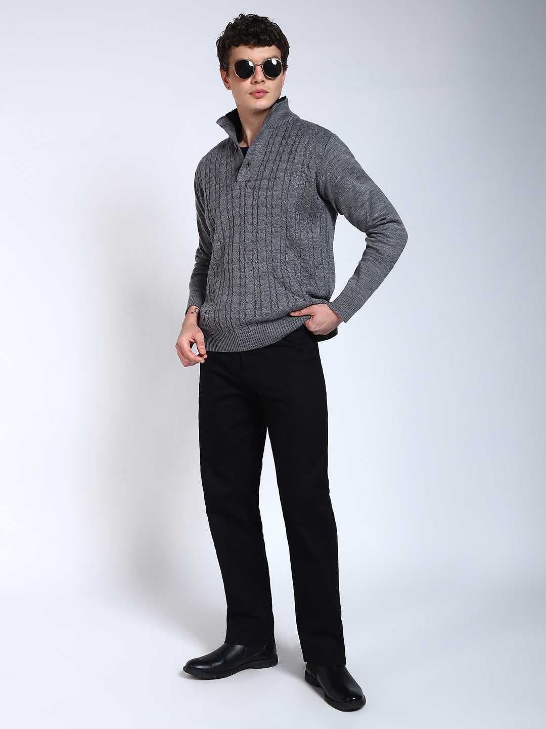 Grey Solid Cable Knit Jumper-Sweater. Has a Mock Collar, Full Sleeve,Regular Fit, Cable Knit Fabric, Fur Detailing and Staright Hem.