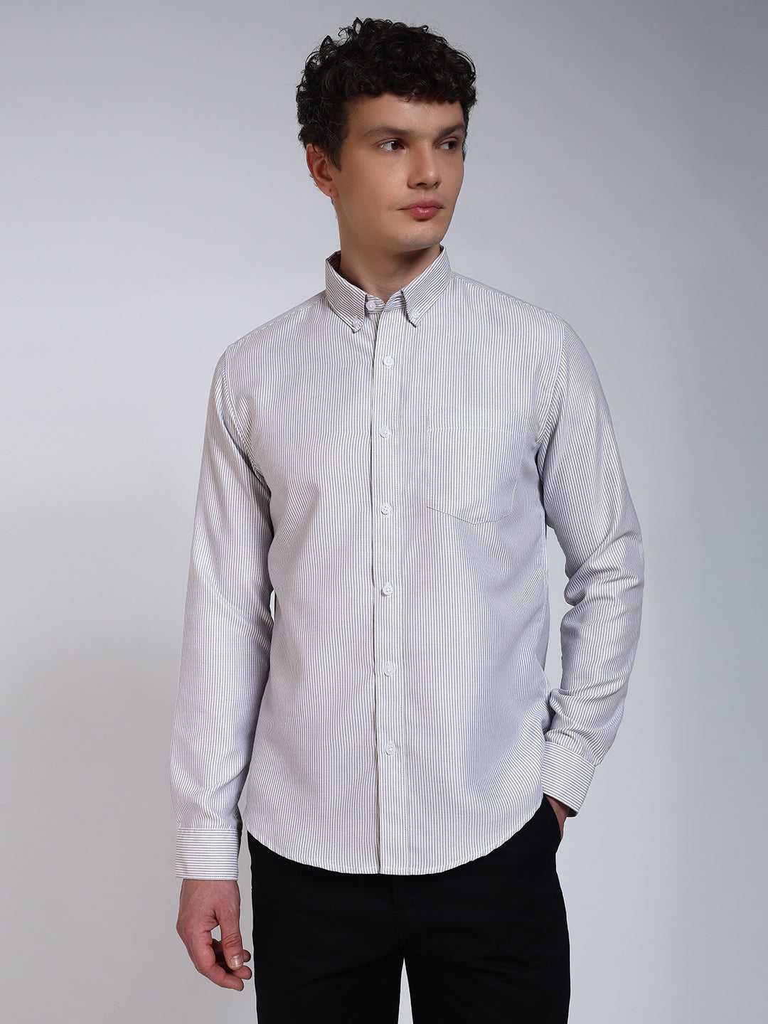 Grey Striped Slim Fit Cotton Shirt. Has a Full Sleeve, Button Down Collar, Cotton Fabric, Front Placket With Curved Hem.